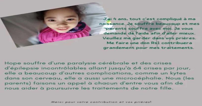 La collecte de fonds sera d'une grande aide pour que le parents de Hope puisse faire, son orthophonie et sa physiothérapie deux fois par semaine et ses médicaments.