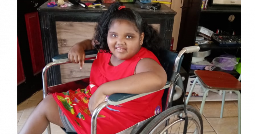 Je m'appelle Guylaine Louis et j'habite la region de Port Louis. J'ai une fille de 9 ans qui s'appelle Felicia, elle ne peux pas marcher ni parler car elle a L'hydrocéphalie depuis l'âge de 3 ans. Cette maladie est une accumulation de liquide dans le cerveau.