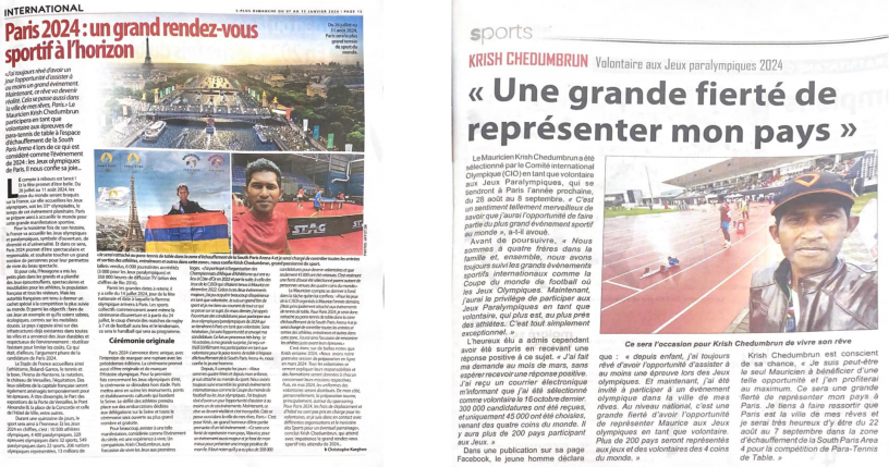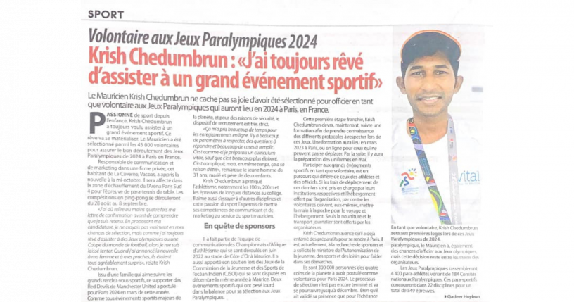 I was a volunteer in charge of Press & Communication for CJSOI 2022 held in Mauritius for Table Tennis and the African Championship in Athletics held in Maurtiius at Cote D'Or in 2022. Through those events, i was able to gather major experience for an international event and this eased my way to be selected for Paris 2024 Paralympic Games as a Volunteer.
