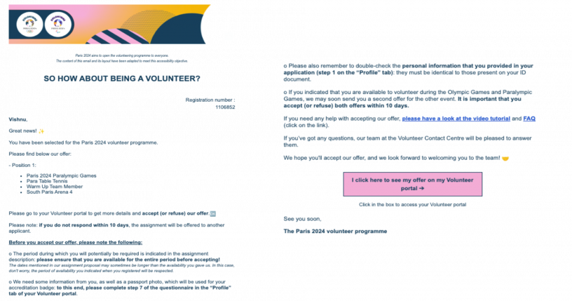It is a great pride to have been selected as a volunteer for the next Paralympic Games which will take place in Paris, France, as from August 2024. I was selected from 300,000 applications to be one of only 45,000 selected.
